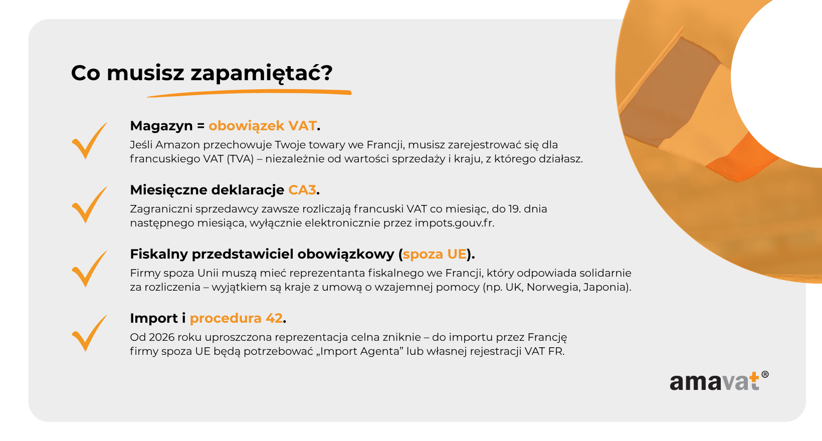 W kontekście sprzedaży przez Amazon FBA te zmiany mają szczególne znaczenie. Amazon coraz częściej wykorzystuje francuskie centra dystrybucyjne jako punkt wprowadzenia towarów spoza UE na rynek unijny. Dzięki ATVAI i procedurze 42 możliwe jest uniknięcie podwójnego finansowania VAT przy imporcie i transporcie towarów między krajami.