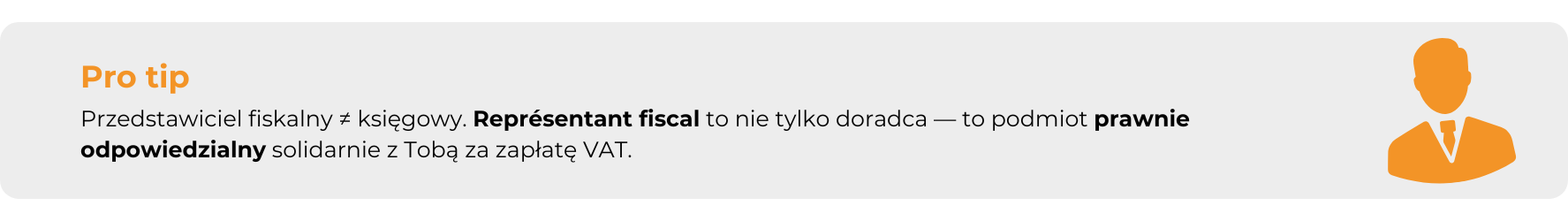 Zasadniczo francuskie przepisy (art. 289 A Code Général des Impôts) wymagają, aby podmiot spoza UE wyznaczył przedstawiciela fiskalnego. Taki przedstawiciel jest zarejestrowany we Francji, zatwierdzony przez administrację podatkową i odpowiada solidarnie za Twoje zobowiązania z tytułu VAT. To on reprezentuje Twoją firmę przed urzędem skarbowym, składa deklaracje i kontaktuje się w Twoim imieniu z administracją podatkową.
