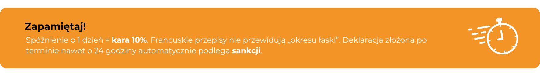Jeżeli deklaracja zostanie złożona w terminie, ale płatność VAT nie zostanie dokonana do dnia wymagalności, fiskus nalicza odrębną sankcję finansową. Podstawowa kara wynosi 5% kwoty należnego podatku, zgodnie z art. 1731 CGI, i jest nakładana niezależnie od długości opóźnienia.
