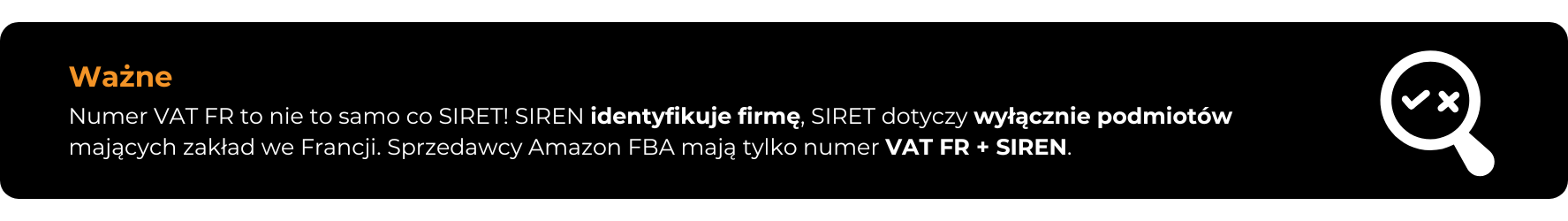 SIRET natomiast rozszerza numer SIREN o pięć dodatkowych cyfr i służy do identyfikowania konkretnej placówki lub zakładu (établissement) na terytorium Francji. Jest nadawany tylko wtedy, gdy firma posiada stałe miejsce prowadzenia działalności (établissement stable) — na przykład własny magazyn, biuro lub pracowników zatrudnionych lokalnie. Sprzedawcy Amazon FBA, którzy korzystają z magazynów Amazona, nie otrzymują SIRET, ponieważ nie dysponują własną placówką.