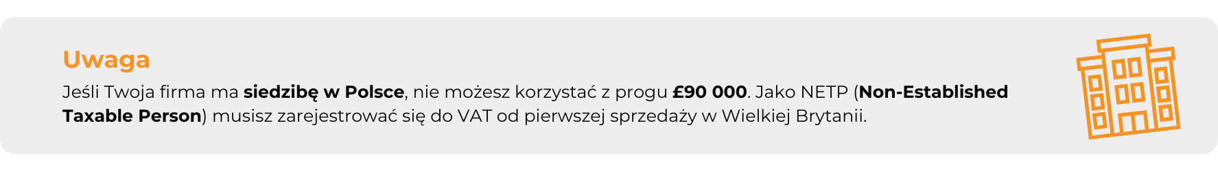 Jeśli prowadzisz firmę z siedzibą w Polsce lub w innym kraju spoza Wielkiej Brytanii, jesteś dla HMRC podatnikiem nieustanowionym (NETP). W takim przypadku próg rejestracji nie ma zastosowania. Musisz zarejestrować się do VAT w Wielkiej Brytanii, gdy tylko dokonujesz lub zamierzasz dokonywać opodatkowanych dostaw towarów na jej terytorium.