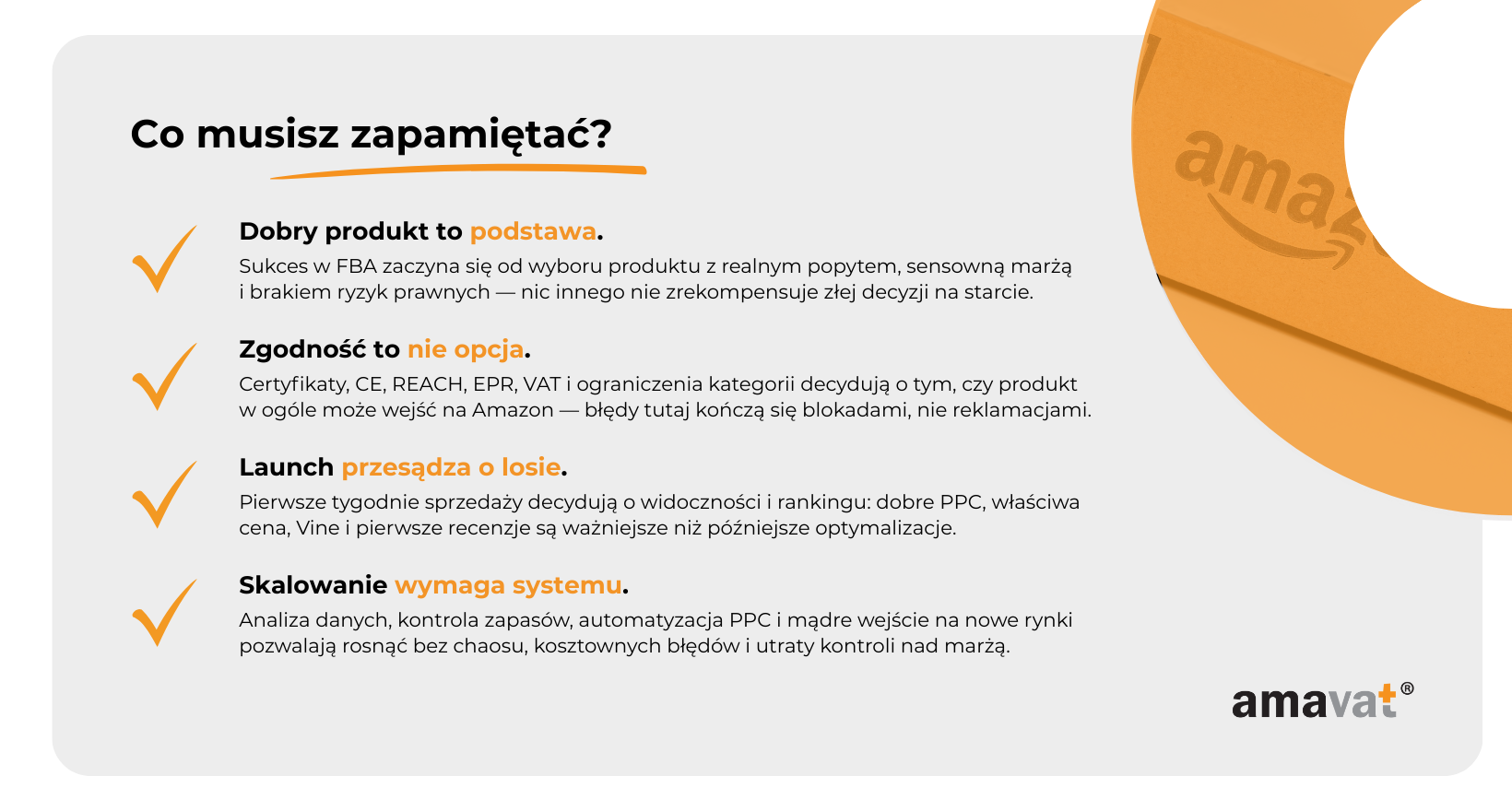 Mimo tych wyzwań model FBA pozostaje jednym z najskuteczniejszych sposobów prowadzenia sprzedaży na Amazonie. Daje szybki dostęp do infrastruktury, która normalnie wymagałaby dużych inwestycji, i pozwala przedsiębiorcom skupić się na najważniejszych obszarach rozwoju — nowych produktach, marketingu i budowaniu marki. Dla młodych firm e-commerce to często najlepsza droga, by wejść na większe rynki i przetestować potencjał produktów bez konieczności ponoszenia kosztów własnej logistyki.