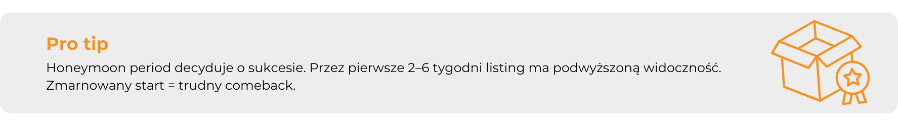 Na samym początku Amazon testuje nowy listing, analizując jego konwersję, jakość ruchu oraz tempo sprzedaży. Ten tak zwany okres „honeymoon” trwa zwykle kilka tygodni i jest wyjątkowo ważny, bo każdy sygnał wysłany do algorytmu wpływa na dalszą widoczność produktu. Aby zdobyć pierwsze sprzedaże, produkt powinien wejść na rynek z uczciwą, celowo obniżoną ceną, która zmniejsza barierę zakupu i maksymalizuje konwersję. Amazon premiuje listingi, które szybko udowadniają, że potrafią sprzedawać, dlatego startowe kilka–kilkanaście transakcji bywa kluczowe.
