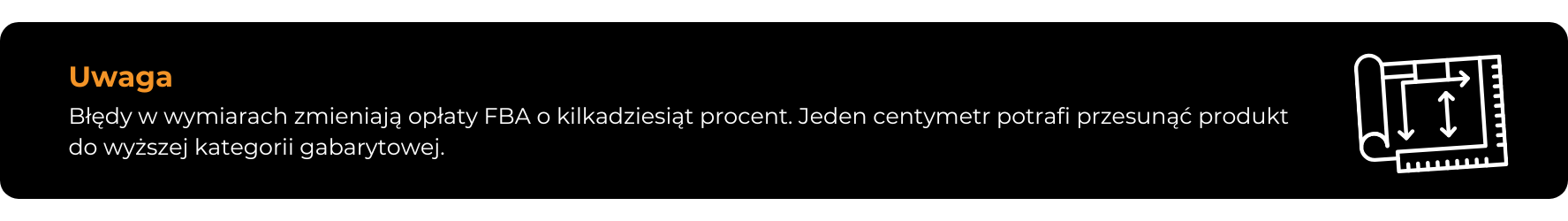 Bardzo ważne jest poprawne wpisanie wymiarów. Amazon dokonuje własnych pomiarów, a jeśli różnica między wartościami podanymi w Seller Central a rzeczywistością jest znacząca, platforma może zmienić kategorię gabarytową SKU, co automatycznie podniesie fulfillment fee. Czasem błędny wymiar zwiększa opłatę nawet o kilkadziesiąt procent.