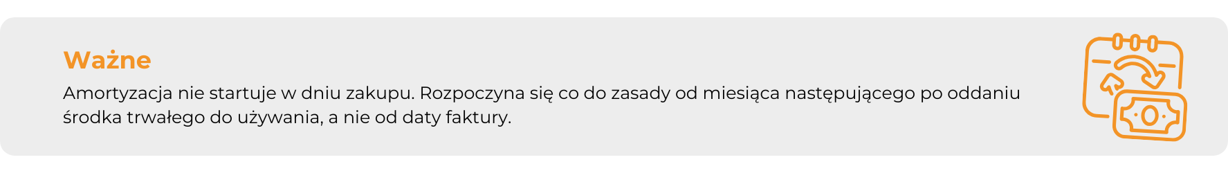Odpisów amortyzacyjnych dokonuje się co do zasady od miesiąca następującego po miesiącu wprowadzenia składnika do ewidencji. Oznacza to, że nawet jeśli środek trwały został oddany do używania pod koniec miesiąca, pierwszy odpis pojawi się dopiero w kolejnym miesiącu. Ten szczegół bywa często pomijany, a ma realne znaczenie przy planowaniu kosztów w danym roku podatkowym.