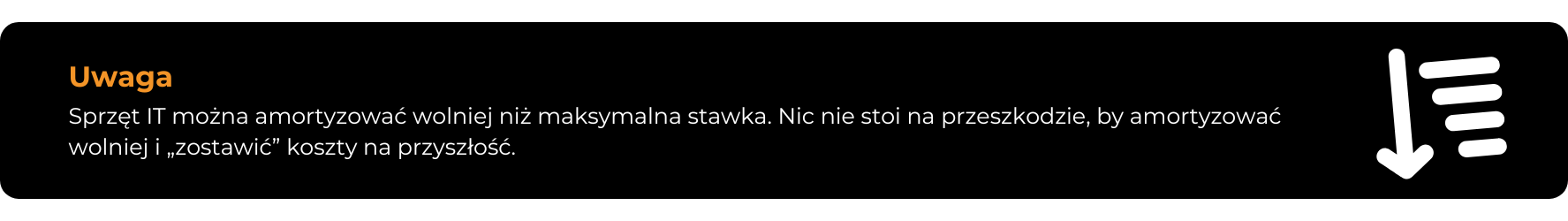 Dla e-commerce amortyzacja jednorazowa może być szczególnie atrakcyjna w okresach intensywnych inwestycji, gdy firma potrzebuje szybko obniżyć podstawę opodatkowania i zachować większą elastyczność finansową. Warto jednak pamiętać, że jednorazowe ujęcie kosztu oznacza brak dalszych odpisów w kolejnych latach. W stabilnej fazie działalności może to ograniczać możliwości kształtowania wyniku podatkowego w przyszłości.