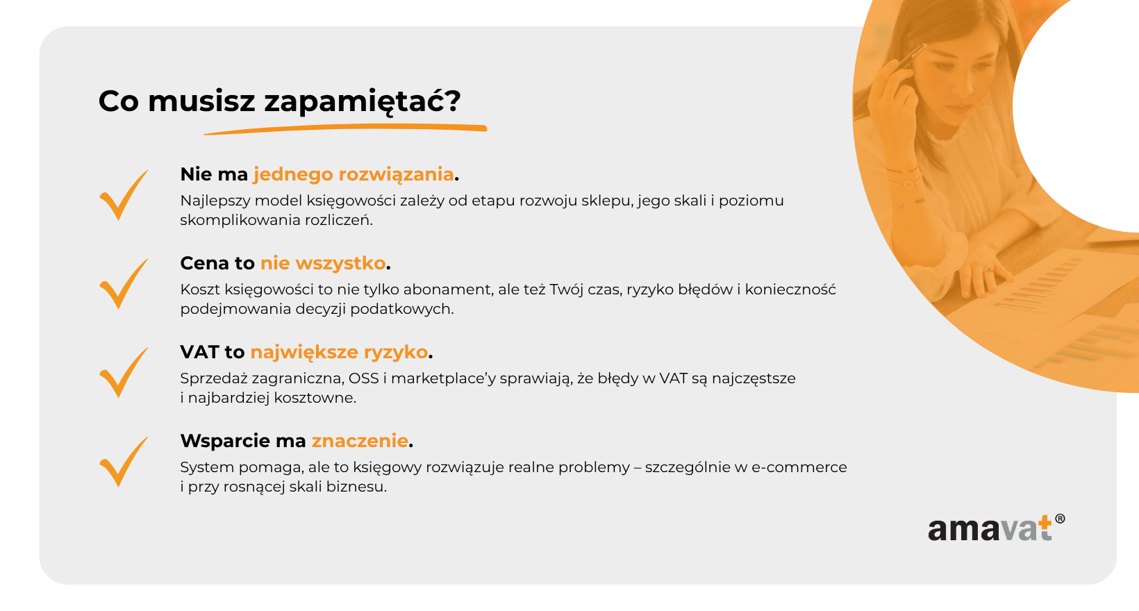 Warto jednak pamiętać, że nie jest to rozwiązanie ograniczone wyłącznie do „małych” biznesów. Są przedsiębiorcy, którzy prowadzą bardziej zaawansowany e-commerce w modelu samodzielnym, szczególnie jeśli mają uporządkowane procesy i odpowiednią wiedzę. Jednocześnie w wielu przypadkach wraz ze wzrostem skali działalności pojawia się potrzeba wsparcia, które wykracza poza możliwości samego systemu. I to właśnie w tym momencie część firm zaczyna rozważać przejście na model oparty o biuro rachunkowe e-commerce lub współpracę z księgowym specjalizującym się w sprzedaży internetowej.