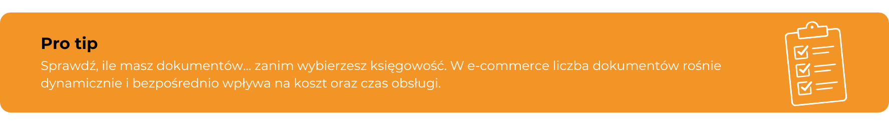 Drugim częstym błędem jest niedoszacowanie liczby dokumentów. W e-commerce liczba zdarzeń księgowych rośnie bardzo szybko. Na początku działalności może to być kilka czy kilkanaście dokumentów miesięcznie, ale wraz ze wzrostem sprzedaży pojawiają się kolejne elementy, takie jak prowizje platform, zwroty, korekty, różne formy płatności czy rozliczenia z operatorami logistycznymi. To bezpośrednio wpływa zarówno na koszt obsługi księgowej, jak i na ilość pracy w modelu samodzielnym. Wiele osób nie bierze tego pod uwagę na starcie i wybiera rozwiązanie, które po kilku miesiącach przestaje być efektywne.