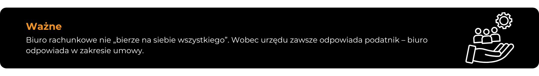 W tym modelu biuro przejmuje prowadzenie rozliczeń i współodpowiada za ich poprawność w zakresie zawartej umowy, natomiast wobec urzędu skarbowego odpowiedzialność nadal spoczywa na podatniku. W praktyce oznacza to jednak większe bezpieczeństwo operacyjne, bo masz do czynienia z osobą, która zajmuje się tym zawodowo i potrafi reagować na bardziej złożone sytuacje.