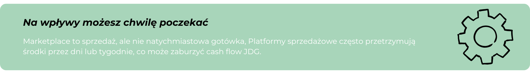 Marketplace’y są wygodne, bo dają dostęp do klientów, ale mają swoją cenę z punktu widzenia cash flow. Pieniądze często nie trafiają do Ciebie od razu. Czasem są wypłacane raz w tygodniu, czasem po spełnieniu określonych warunków, a czasem z opóźnieniem wynikającym z polityki zwrotów. Dla księgowości JDG sprzedaż już się wydarzyła, ale dla Twojego konta bankowego jeszcze niekoniecznie.