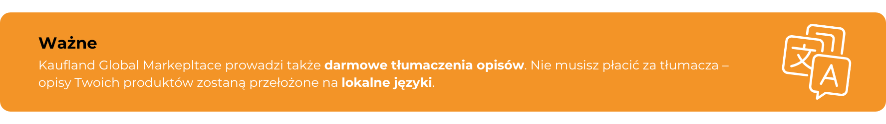 Sprzedaż międzynarodowa wiąże się z wyzwaniem, które potrafi skutecznie zablokować ekspansję – barierą językową. Kaufland Global Marketplace rozwiązuje ten problem, oferując bezpłatne tłumaczenia opisów produktów. To ogromna oszczędność czasu i pieniędzy, ponieważ sprzedawca nie musi zatrudniać tłumacza ani korzystać z zewnętrznych narzędzi.