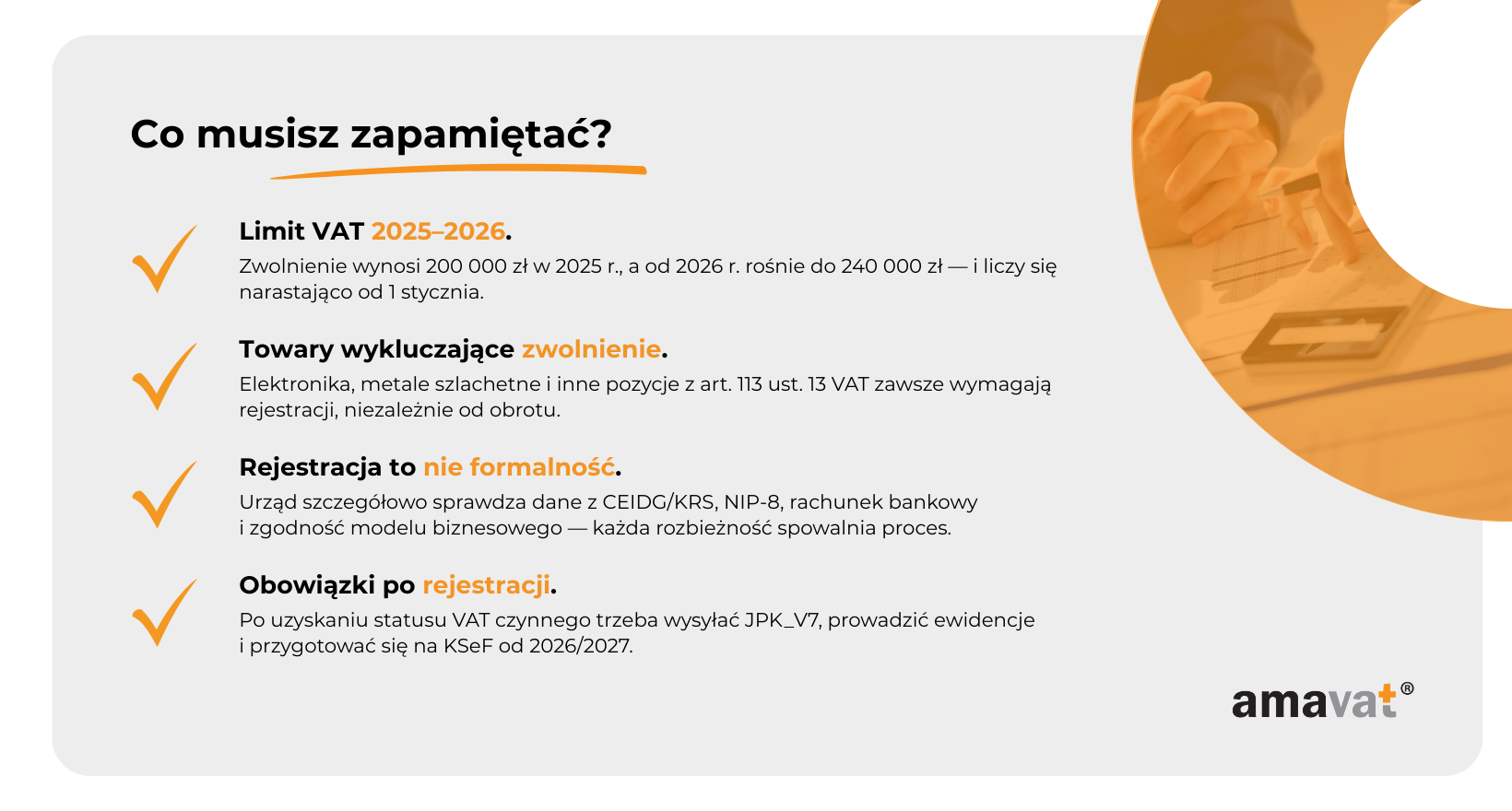 Pierwszy tydzień to moment, w którym przedsiębiorca powinien ustalić, czy rejestracja do VAT jest dla niego obowiązkiem wynikającym z przepisów, czy elementem strategii rozwoju firmy. Kluczowe jest zrozumienie, że limit zwolnienia podmiotowego w 2025 roku wynosi 200 000 zł i liczy się go narastająco od 1 stycznia, dlatego monitoruje się cały roczny obrót, a nie wyłącznie bieżący moment działalności. Warto sprawdzić, czy sprzedawane towary w ogóle pozwalają na korzystanie ze zwolnienia, ponieważ część kategorii — jak elektronika z określonych grup PKWiU — wyklucza taką możliwość niezależnie od wysokości obrotów.