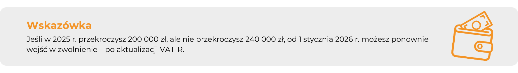 Rok 2026 przyniesie jednak istotną zmianę. Limit zwolnienia wzrośnie do 240 tysięcy złotych. Dlatego przedsiębiorcy, którzy w 2025 roku przekroczą próg 200 tysięcy, ale nie osiągną 240 tysięcy, mogą od 1 stycznia 2026 roku ponownie wejść w zwolnienie podmiotowe, jeśli tylko ich asortyment nie jest objęty wyłączeniami ustawowymi. Wymaga to złożenia aktualizacji VAT-R, lecz nie jest procesem skomplikowanym. W praktyce oznacza to, że zwiększony próg daje młodym firmom nieco więcej elastyczności, szczególnie wtedy, gdy końcówka roku przyniesie niespodziewany wzrost sprzedaży, lecz nie na tyle duży, by przekroczyć nowy limit.