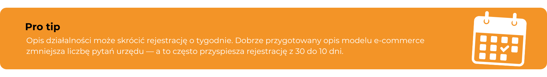 Opis warto przygotować tak, aby pokazywał, jak będzie wyglądać działalność w praktyce: jakie towary będą sprzedawane, jakie kanały sprzedaży zostaną wykorzystane, skąd będą pochodziły produkty, w jaki sposób będą obsługiwani klienci i jakie systemy płatności zostaną wdrożone. Dla e-commerce szczególnie cenna jest informacja o sprzedaży międzynarodowej, korzystaniu z fulfilmentu czy zamiarze wejścia do OSS, ponieważ to właśnie te obszary generują najwięcej dodatkowych pytań ze strony urzędów.