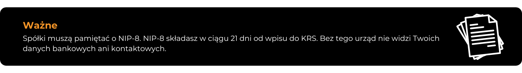 W przypadku spółek wygląda to inaczej, choć także tutaj nie ma potrzeby składania oddzielnego wniosku o nadanie NIP. Rejestr przedsiębiorców przekazuje dane spółki bezpośrednio do urzędu skarbowego, a numer NIP jest nadawany automatycznie. Dopiero po jego otrzymaniu pojawia się obowiązek uzupełnienia danych poprzez formularz NIP-8. Ten dokument nie służy więc do uzyskania numeru NIP, lecz do przekazania szczegółowych informacji, takich jak rachunki bankowe, miejsce prowadzenia działalności, dane kontaktowe czy struktura reprezentacji. NIP-8 należy złożyć w ciągu 21 dni od nadania NIP, a dopiero po tym etapie spółka może przejść do złożenia VAT-R.