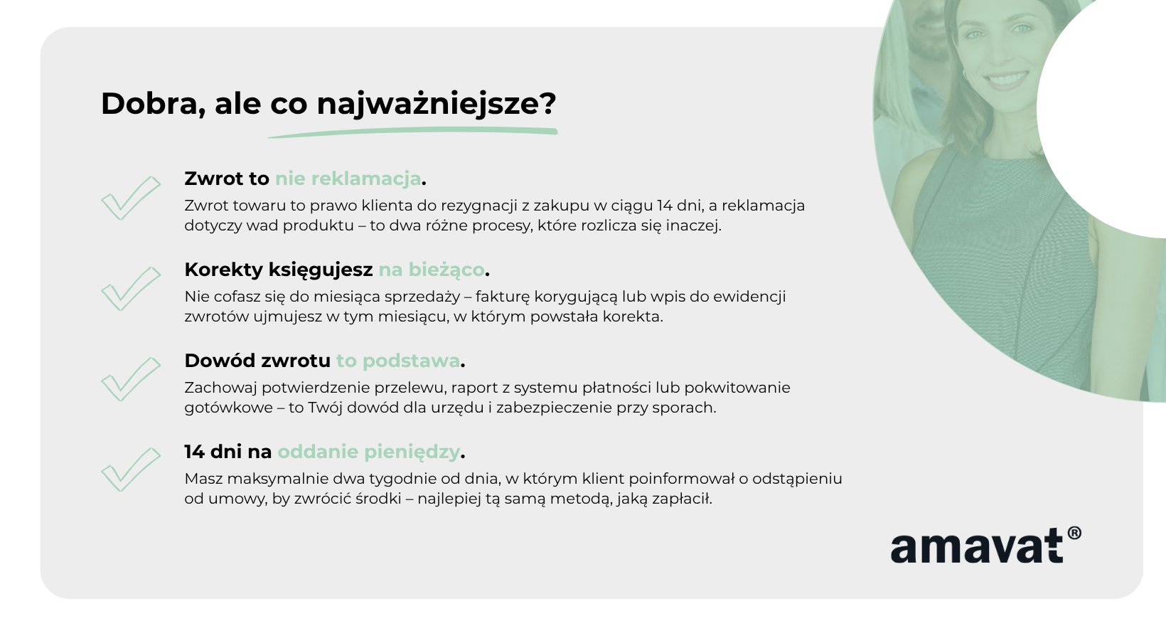 W dalszej części tekstu wspólnie przeprowadzimy Cię przez całą drogę – od momentu, kiedy klient zgłasza chęć zwrotu, przez przygotowanie dokumentów, aż po zapis w księgowości jednoosobowej firmy i rozliczenie podatków takich jak VAT w JDG czy podatek dochodowy. Wszystko w prosty sposób, bez zbędnych terminów, żebyś mógł po prostu wziąć te informacje i zastosować je w praktyce.
