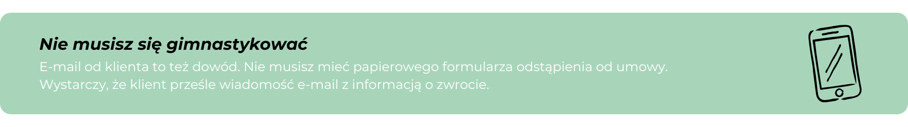 Każdy klient, który kupuje w Twoim sklepie internetowym, ma prawo odstąpić od umowy w ciągu 14 dni od chwili, kiedy odebrał przesyłkę. Wystarczy, że w tym czasie złoży Ci oświadczenie o odstąpieniu od umowy – może to zrobić np. przez e-mail. Nie ma obowiązku tłumaczenia się, dlaczego odsyła produkt.