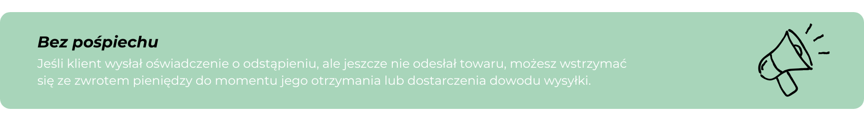 Najważniejsza zasada brzmi: pieniądze trzeba zwrócić niezwłocznie, maksymalnie w ciągu 14 dni od dnia, kiedy klient poinformował Cię o odstąpieniu od umowy. Możesz jednak wstrzymać się z przelewem do momentu, aż dostaniesz towar z powrotem albo przynajmniej dowód, że został wysłany.