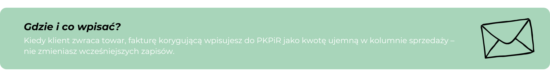 Przykład: sprzedałeś produkt w styczniu za 500 zł. W marcu klient go zwraca. Wystawiasz fakturę korygującą i na jej podstawie w marcu robisz zapis „–500 zł” w kolumnie 7 PKPiR. Styczniowe przychody zostają bez zmian.