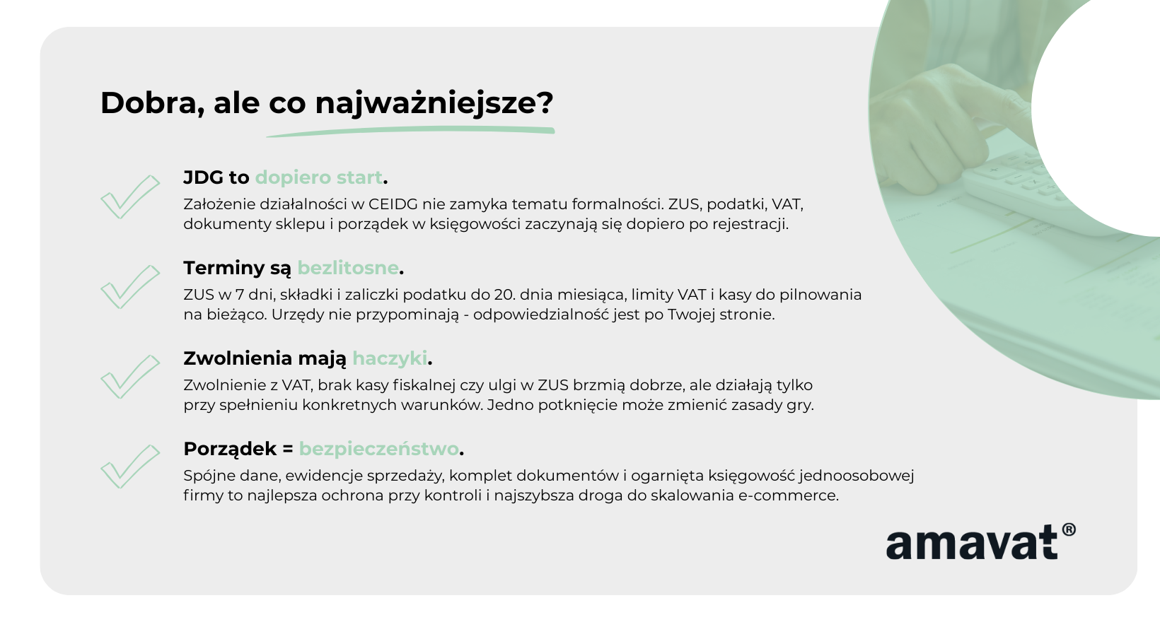 Założenie JDG to moment, w którym wiele osób ma poczucie „już po wszystkim”. W e-commerce to złudzenie. Pierwsze tygodnie po rejestracji firmy są kluczowe, bo właśnie wtedy najłatwiej coś przegapić, a jednocześnie najłatwiej ustawić dobre nawyki na przyszłość.