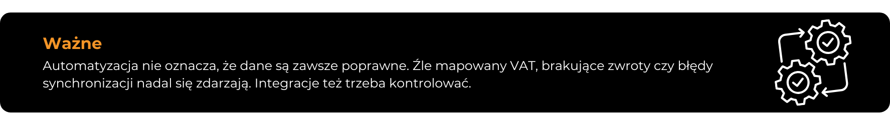 W praktyce wiele sklepów buduje sprawnie działającą księgowość e-commerce właśnie w takim modelu połączeń. Kluczowe nie jest jednak samo istnienie integracji, ale poprawność mapowania danych i jakość procesu. Integracje mogą wspierać księgowość, ale zwykle nie zastępują kontroli danych ani nie usuwają automatycznie ryzyka błędów.