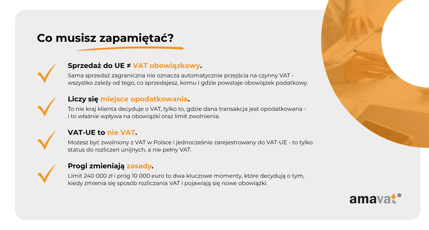 Czyli tak, możesz sprzedawać do UE bez bycia czynnym VAT-owcem, ale nie oznacza to, że temat VAT Cię nie dotyczy.
