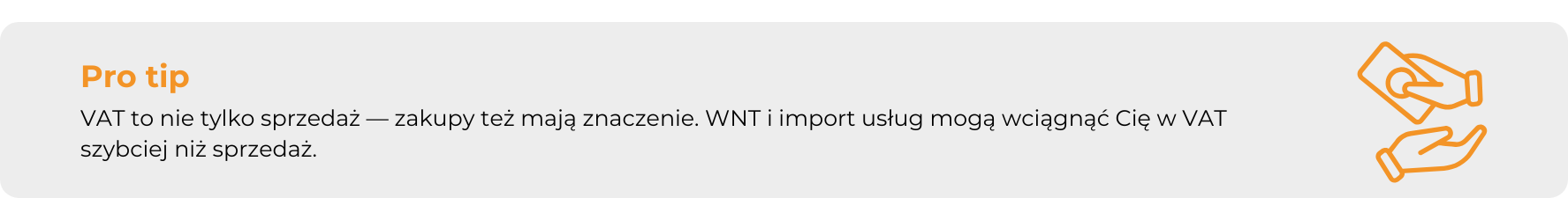 To bardzo ważne rozróżnienie, bo wielu przedsiębiorców traktuje VAT-UE jako „wejście w VAT”, a w rzeczywistości jest to odrębny obowiązek rejestracyjny, który nie pozbawia Cię zwolnienia podmiotowego.
