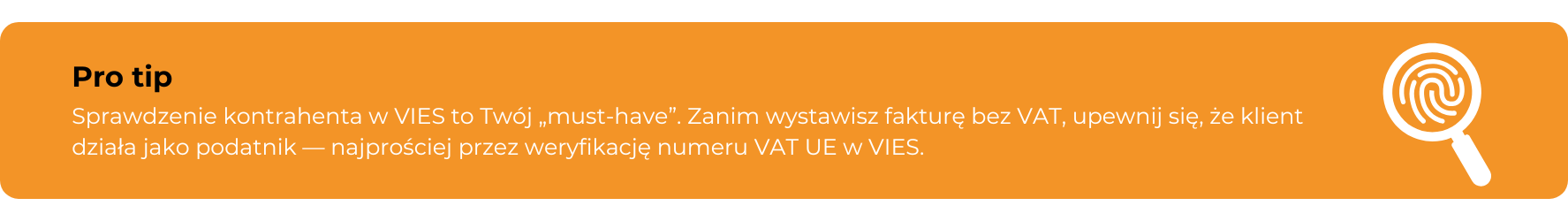 Z Twojej perspektywy to uproszczenie, bo nie doliczasz VAT i nie odprowadzasz go w Polsce, ale nie oznacza to braku obowiązków. Musisz przede wszystkim potwierdzić, że kontrahent występuje jako podatnik. W praktyce najczęściej oznacza to sprawdzenie jego numeru VAT UE w systemie VIES, ale kluczowy jest faktyczny status podatnika, a nie sam numer jako formalność.
