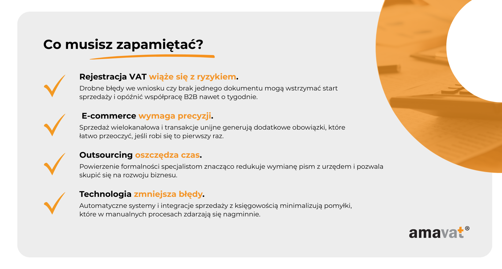 Niniejsza publikacja ma charakter niewiążącej informacji i służy ogólnym celom informacyjnym. Przedstawione informacje nie stanowią doradztwa prawnego, podatkowego ani w zakresie zarządzania, jak również nie zastępują indywidualnego doradztwa. Przy opracowaniu niniejszej publikacji dołożono należytej staranności, jednak bez przejęcia odpowiedzialności za prawidłowość, aktualność i kompletność prezentowanych informacji. Treści w niej zawarte nie stanowią samodzielnej podstawy do działania i nie mogą zastąpić konkretnego doradztwa w indywidualnej sprawie. Odpowiedzialność autorów lub amavat® jest wyłączona. W razie potrzeby uzyskania wiążącej opinii prosimy o bezpośredni kontakt z nami. Treść niniejszej publikacji stanowi własność intelektualną amavat® lub firm partnerskich i podlega ochronie z tytułu praw autorskich. Osoby korzystające z tych informacji mogą pobierać, drukować i kopiować treść publikacji wyłącznie na własne potrzeby.