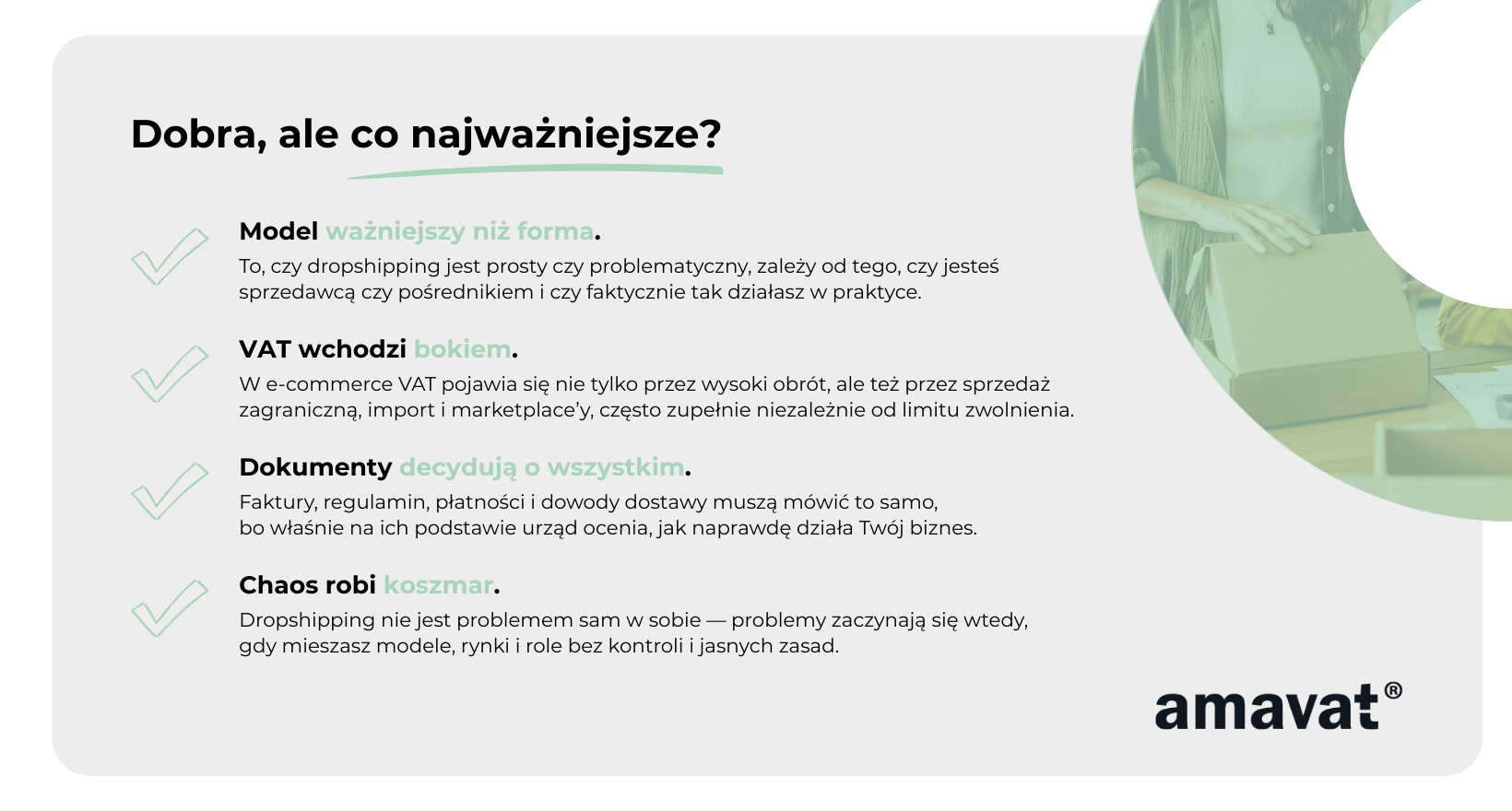 VAT w dropshippingu nie jest więc „zły” ani „dobry” sam w sobie. Jest po prostu bardzo wrażliwy na szczegóły. W kolejnych częściach artykułu zobaczysz, że najwięcej problemów pojawia się wtedy, gdy przedsiębiorca nie do końca wie, w jakiej roli działa, a dokumenty i procesy nie nadążają za rzeczywistością biznesową.