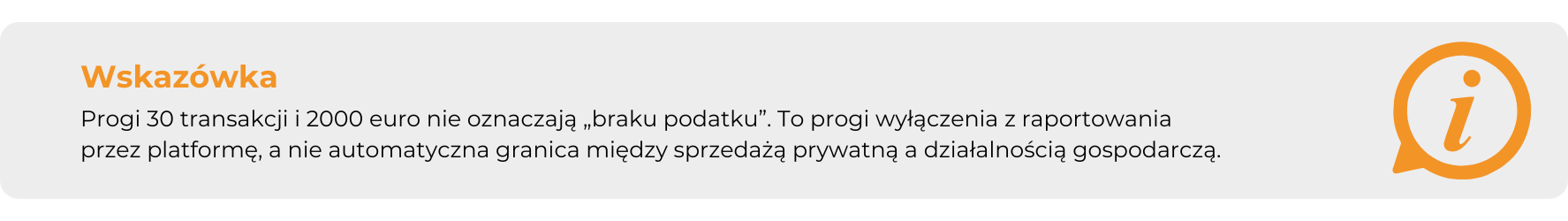 W przypadku sprzedaży towarów dyrektywa przewiduje progi wyłączenia z raportowania, które mają na celu ochronę drobnej, okazjonalnej sprzedaży. Sprzedawca nie jest co do zasady raportowany, jeżeli w danym roku kalendarzowym zrealizował mniej niż 30 transakcji sprzedaży towarów i jednocześnie łączna kwota wypłaconego lub uznanego wynagrodzenia nie przekroczyła 2 000 euro. Dopiero przekroczenie jednego z tych progów powoduje, że platforma ma obowiązek zebrać dane sprzedawcy i uwzględnić go w raporcie przekazywanym administracji skarbowej.