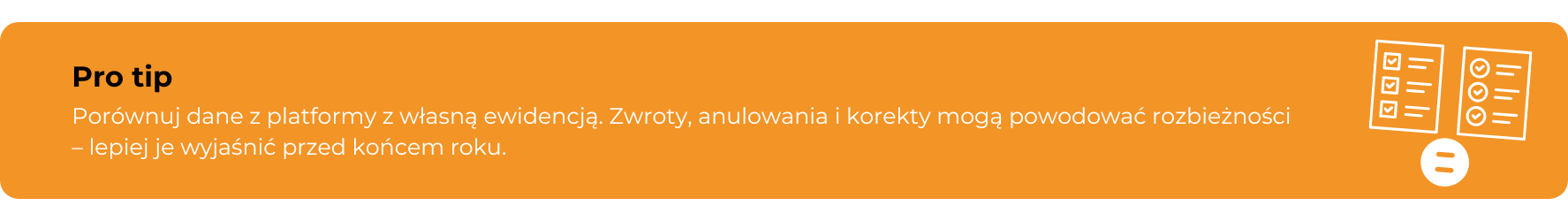 Dobrą praktyką jest również porównywanie własnych zestawień sprzedaży z danymi widocznymi w panelu platformy. Jeżeli pojawiają się rozbieżności, na przykład wynikające ze zwrotów, anulowań czy korekt, warto je wyjaśnić jeszcze przed końcem roku. Ponieważ raportowanie opiera się na danych platformy, wcześniejsze wyjaśnienie niezgodności ogranicza ryzyko, że raportowane informacje będą niespójne z własną ewidencją i rozliczeniami podatkowymi.