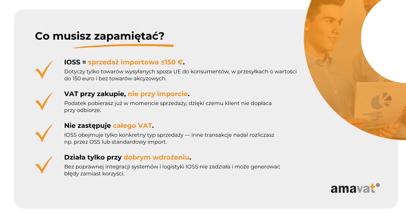 Trzeba jednak jasno powiedzieć, że korzyści te dotyczą wyłącznie sprzedaży spełniającej warunki IOSS, w szczególności przesyłek o wartości do 150 euro i nieobejmujących towarów akcyzowych. IOSS nie zastępuje wszystkich obowiązków VAT w działalności e-commerce, tylko upraszcza konkretny typ sprzedaży importowej.