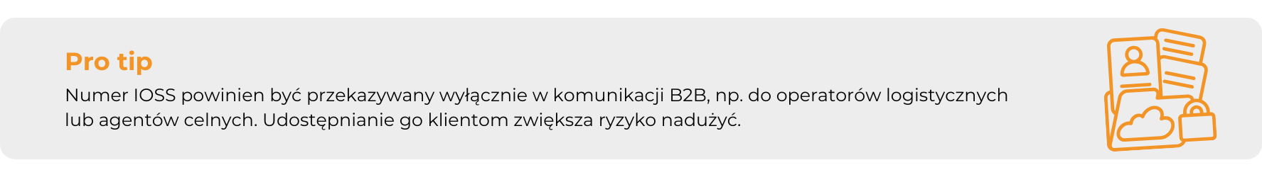 Warto też pamiętać, że numer IOSS powinien być przekazywany wyłącznie w komunikacji B2B, na przykład do operatorów logistycznych lub agentów celnych, i nie powinien być udostępniany klientom.