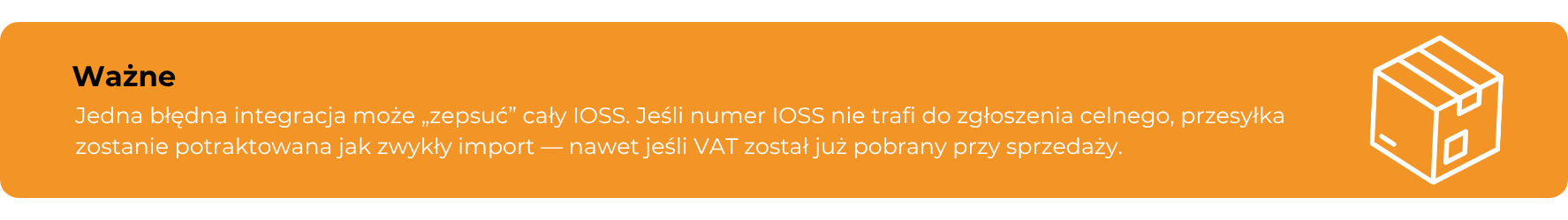 To jeden z najbardziej wrażliwych momentów w całym procesie. Jeśli numer nie zostanie poprawnie przekazany, przesyłka może zostać potraktowana jak zwykły import poza IOSS, co oznacza ryzyko ponownego naliczenia VAT przy imporcie. W efekcie klient może zostać obciążony dodatkowymi kosztami, a cały sens stosowania IOSS zostaje utracony.