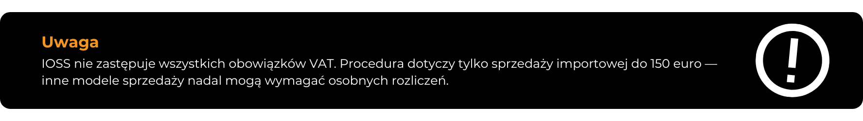 To rozróżnienie jest ważne, bo IOSS nie zastępuje wszystkich obowiązków podatkowych przedsiębiorcy w Unii Europejskiej. Upraszcza tylko konkretny fragment działalności, czyli sprzedaż na odległość towarów importowanych, i właśnie w tym obszarze daje największą wartość. Jeżeli prowadzisz inne typy sprzedaży, na przykład magazynujesz towar w UE albo realizujesz dostawy lokalne, mogą nadal pojawić się dodatkowe obowiązki VAT poza IOSS.
