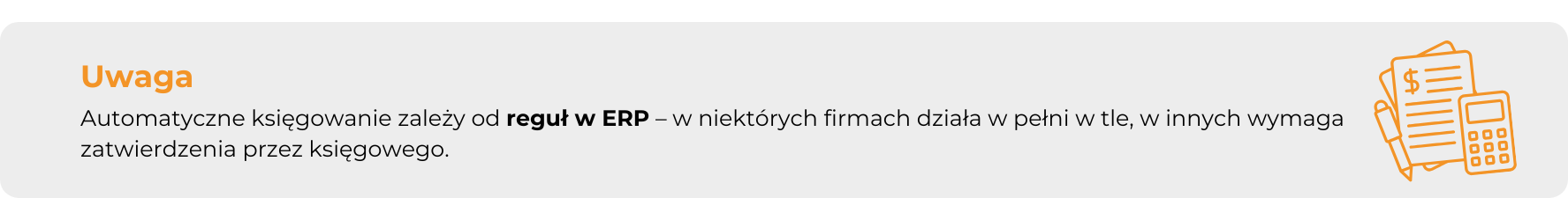 Na końcu następuje księgowanie. W nowoczesnych systemach ERP faktury mogą być automatycznie przypisywane do odpowiednich rejestrów i kont księgowych zgodnie z ustalonymi wcześniej regułami. Stopień automatyzacji zależy od konfiguracji – w niektórych firmach proces może być w pełni automatyczny, w innych wymaga jeszcze zatwierdzenia przez księgowego.