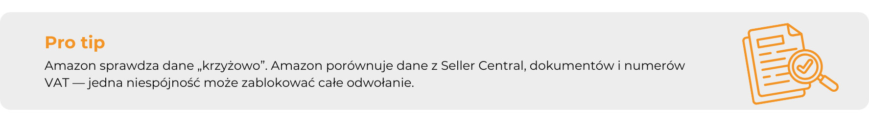 Wielu sprzedawców próbuje przyspieszyć proces, wysyłając odwołanie jeszcze przed pełnym uporządkowaniem VAT. W praktyce Amazon zazwyczaj weryfikuje, czy przedstawione informacje znajdują potwierdzenie w dostępnych danych i dokumentach. Jeżeli numer VAT nie jest aktywny, dane się nie zgadzają albo dokumenty są niekompletne, taka odpowiedź najczęściej nie rozwiązuje problemu i zwykle wydłuża proces przywracania konta. Dlatego znacznie skuteczniejsze jest podejście odwrotne: najpierw uporządkować rozliczenie VAT i rejestrację VAT, a dopiero później przygotować odwołanie.