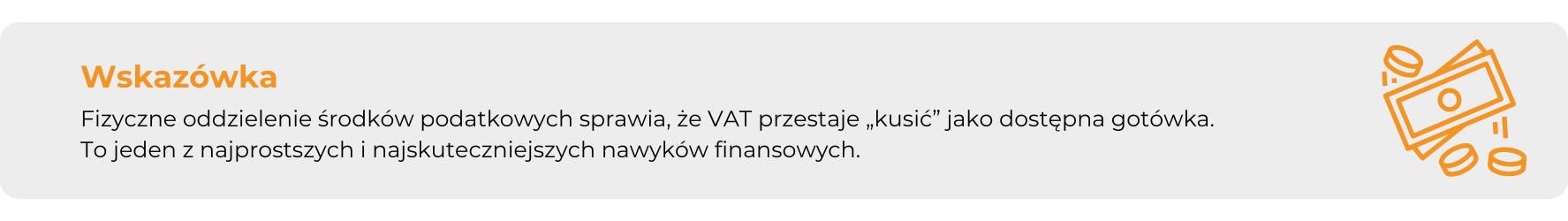 Jedną z najważniejszych zasad zarządzania płynnością podatkową jest fizyczne oddzielenie pieniędzy przeznaczonych na VAT od pozostałej gotówki firmowej. Chodzi o to, aby kwoty odpowiadające podatkowi nie mieszały się z pieniędzmi, które finansują bieżące funkcjonowanie biznesu. Dzięki temu znika podstawowa pokusa wydawania środków, które tylko pozornie wyglądają jak nadwyżka finansowa.
