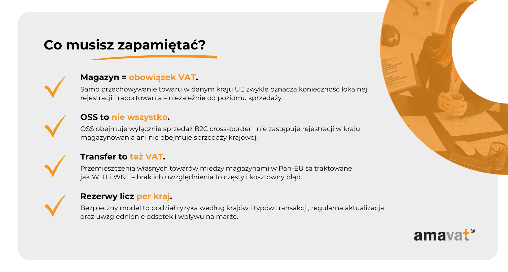 I właśnie dlatego rezerwy podatkowe nie mogą być liczone globalnie jako jeden procent od całej sprzedaży w UE. Musisz rozbić ryzyko na kraj magazynowania, kraj konsumenta, transfery własnych towarów oraz okresy historyczne, w których rejestracja mogła być spóźniona.