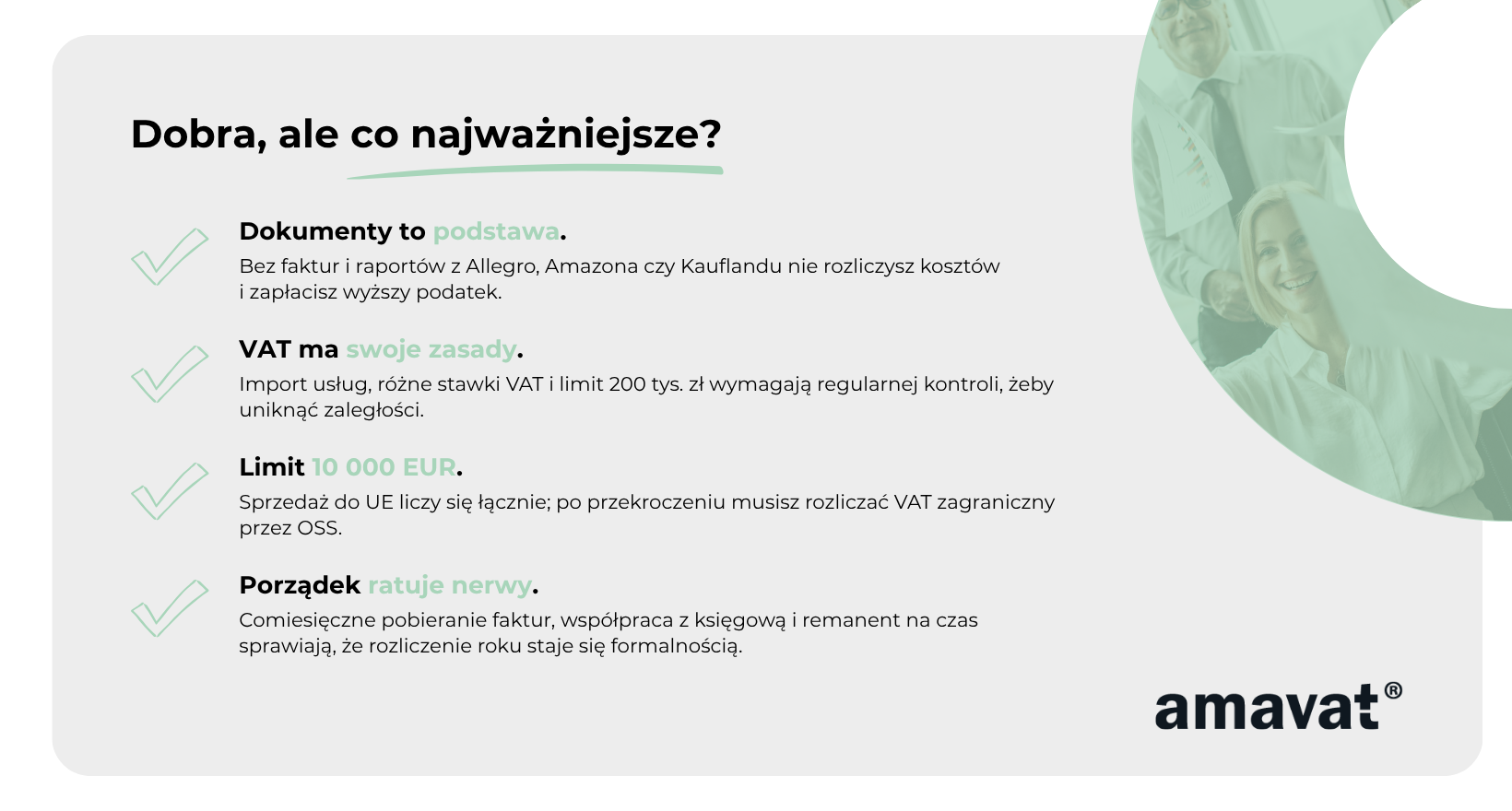 Dla osób prowadzących sprzedaż w internecie rozliczenie podatków może wydawać się szczególnie skomplikowane. Allegro, Amazon czy Kaufland naliczają prowizje, wystawiają faktury i raporty, a do tego dochodzą koszty reklamy, wysyłki i zakupu towarów. Łatwo się w tym pogubić, zwłaszcza jeśli prowadzisz działalność samodzielnie i dopiero oswajasz się z takimi pojęciami jak VAT w JDG czy kwota wolna od podatku. Na szczęście uporządkowanie dokumentów i przygotowanie się do końcoworocznego rozliczenia nie musi być stresujące.