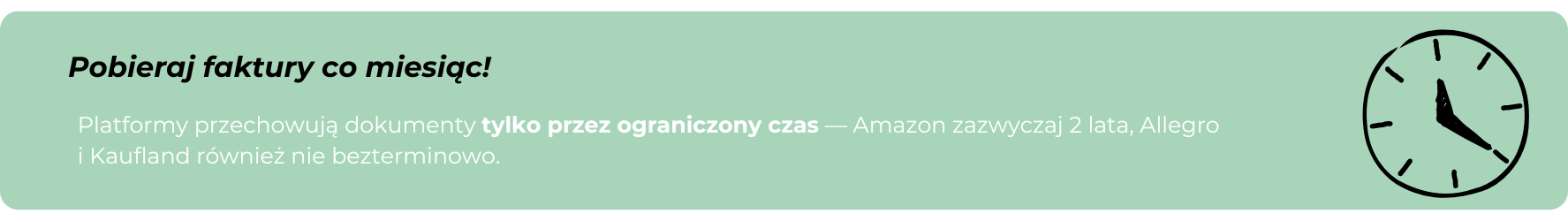 Częsty błąd to poleganie wyłącznie na danych z paneli sprzedażowych. Widzisz w nich zestawienie prowizji czy kosztów reklam, ale to nie są dokumenty księgowe. Koszt rozliczysz tylko wtedy, gdy masz fakturę albo oficjalny raport. Platformy takie jak Amazon czy Allegro nie przechowują dokumentów bez końca – np. Amazon udostępnia historię płatności maksymalnie na 2 lata wstecz. Jeśli zapomnisz pobrać faktury w terminie, koszt przepada i zapłacisz wyższy podatek. Rozwiązanie? Raz w miesiącu pobieraj faktury i od razu wrzucaj je do swojego folderu w chmurze.