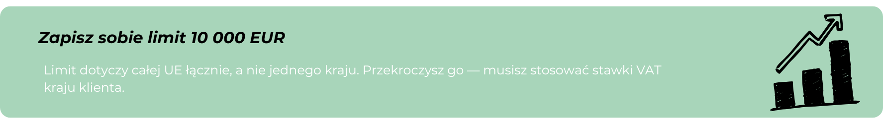 Sprzedając za granicę, musisz znać zasady WSTO. Limit to 10 000 euro rocznie (ok. 42 tys. zł) łącznie dla całej UE i dotyczy sprzedaży B2C oraz usług elektronicznych. Jeśli go przekroczysz, VAT liczysz według stawek kraju klienta. Żeby nie rejestrować się w każdym kraju osobno, możesz skorzystać z OSS. To system, w którym składasz jedną deklarację kwartalną w Polsce i rozliczasz w niej zagraniczny VAT. Ale pamiętaj – OSS dotyczy tylko sprzedaży wysyłkowej. Jeśli korzystasz z magazynów zagranicznych (np. Amazon FBA w Niemczech), lokalna rejestracja VAT i tak jest obowiązkowa.
