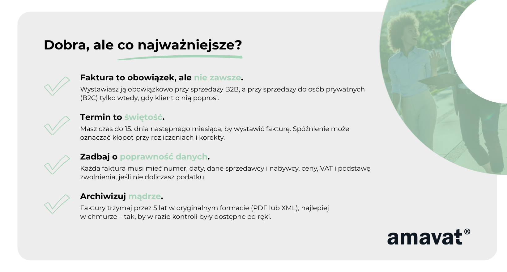 Warto też pamiętać o terminach. Masz czas do piętnastego dnia miesiąca następującego po miesiącu, w którym sprzedałeś towar albo wykonałeś usługę. Na przykład, jeśli sprzedaż odbyła się 20 maja, najpóźniej do 15 czerwca musisz wystawić fakturę. W teorii daje to sporo luzu, ale w praktyce nikt nie czeka aż tak długo. Firmy chcą otrzymać faktury od razu, żeby szybko je zaksięgować i odliczyć VAT. Dlatego dobrym nawykiem w księgowości działalności gospodarczej jest wystawianie faktury od razu po sprzedaży.