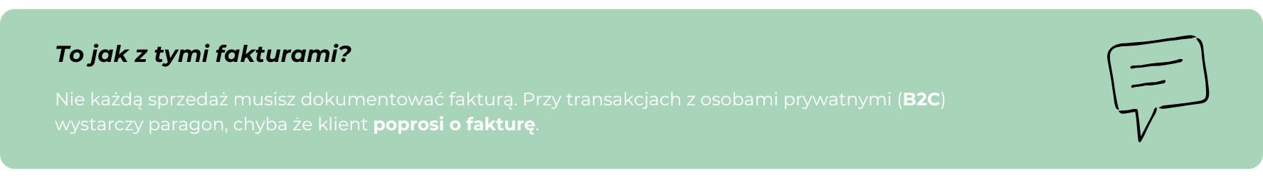 Inny przykład to sprzedaż na Amazonie. Większość transakcji na tej platformie to zakupy dokonywane przez osoby prywatne, czyli sprzedaż B2C. Faktura nie musi być dołączona automatycznie do każdej paczki. Ale jeśli któryś klient zgłosi się do ciebie z prośbą o wystawienie faktury, zasada jest taka sama – musisz to zrobić.