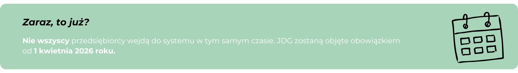 - od 1 kwietnia 2026 roku KSeF obejmie wszystkich pozostałych przedsiębiorców, w tym zdecydowaną większość JDG,