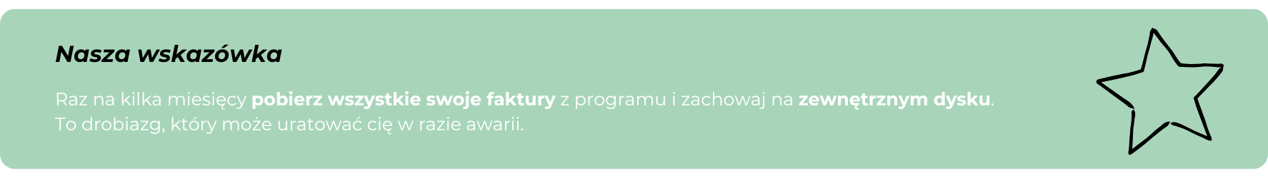 Niektórzy początkujący przedsiębiorcy myślą, że faktura wysłana mailem „jakoś się zachowa” i kasują ją z własnego komputera. To ryzykowne podejście. Faktury muszą być przechowywane przez pięć lat w oryginalnym formacie i w sposób zapewniający ich integralność i czytelność. Jeśli tego nie dopilnujesz, w razie kontroli nie będziesz w stanie okazać wymaganych dokumentów. Dlatego najlepiej trzymać je w programie fakturowym z archiwum w chmurze oraz robić kopie zapasowe na dysku zewnętrznym.