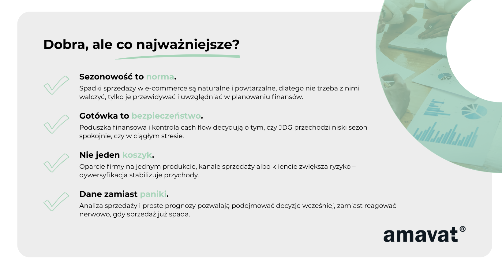 I tu jest sedno. Sezonowość w e-commerce często nie zabija firm dlatego, że przez chwilę jest mniej zamówień. Ona zabija firmy wtedy, gdy nie masz planu na to, jak przetrwać ten czas bez paniki. Gdy zbyt optymistycznie planujesz wydatki na podstawie najlepszych miesięcy. Gdy traktujesz dobry okres jak coś trwałego, a nie jak falę, po której naturalnie przyjdzie spokojniejszy moment.