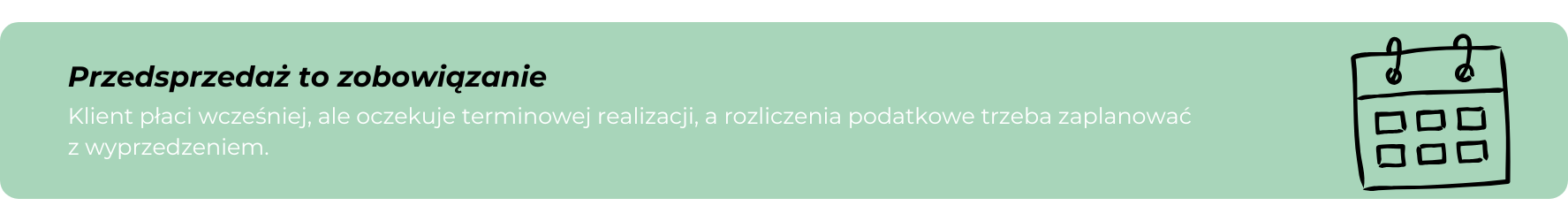 Warto jednak pamiętać, że przedsprzedaż to także zobowiązanie. Musisz jasno komunikować terminy realizacji i dotrzymywać obietnic. Opóźnienia prowadzą do zwrotów, reklamacji i napięć z klientami, co w JDG szybko przekłada się na problemy operacyjne. Dobrze też mieć świadomość, że przy przedsprzedaży liczy się moment rozliczeń podatkowych, dlatego warto zaplanować ją wspólnie z księgowością, zanim pieniądze znikną z konta na inne cele.
