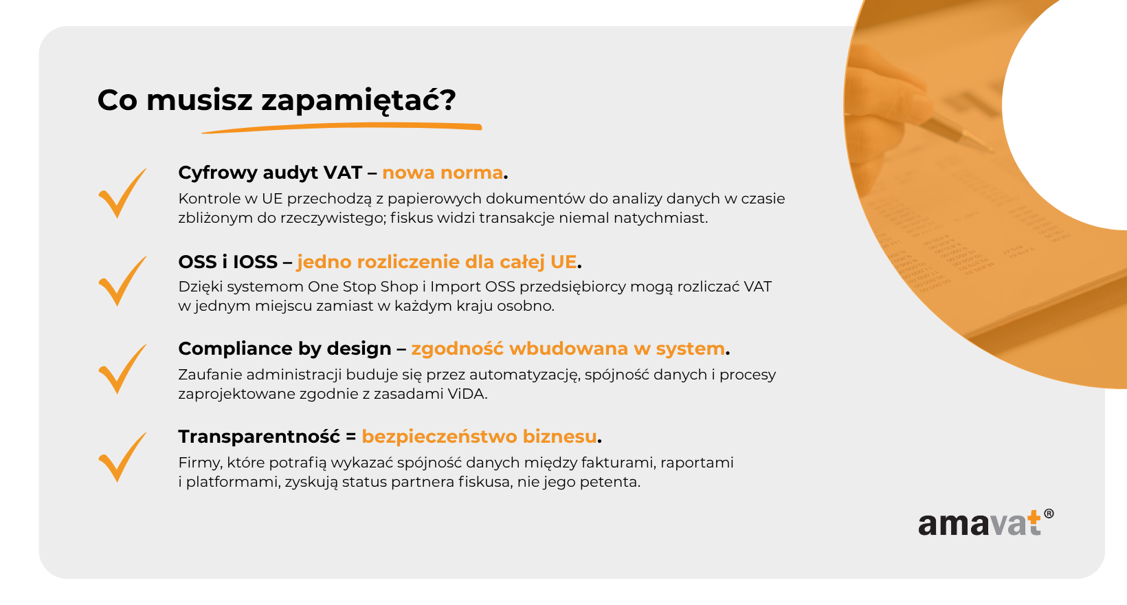 W perspektywie kolejnych lat ViDA doprowadzi do pełnej integracji nadzoru podatkowego i handlowego w ramach jednolitego, cyfrowego rynku. Transparentność, automatyzacja i gotowość technologiczna staną się nie tylko wymogiem zgodności, ale też nową przewagą konkurencyjną e-commerce. Ci, którzy potraktują zgodność jako element strategii biznesowej, zyskają coś więcej niż spokój w relacjach z fiskusem — zyskają reputację podmiotów nowoczesnych, przewidywalnych i godnych zaufania w cyfrowej gospodarce Europy.